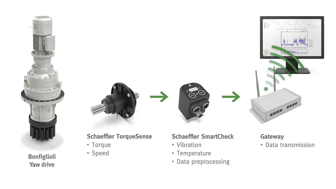 A compact Industry 4.0 solution package for wind turbine azimuth drives is the result of a long-term development partnership between Bonfiglioli and Schaeffler. Schaeffler Torque Sense and SmartCheck sensors record torque, speed, vibration and temperature information. These data are transmitted through a gateway, combined and processed using algorithms, developed by Bonfiglioli and based on the more than 60 years know-how in gearmotors and dedicated specifically for the application. Subsequently, the data will be made available for the users on the Bonfiglioli Cloud platform. The Bonfiglioli Dashboard provides a clear overview of the collected information for the operator. Maintenance measures can be carried out in a load-oriented manner and the unplanned downtimes of the system can be minimized, and operating costs can even be more than halved.