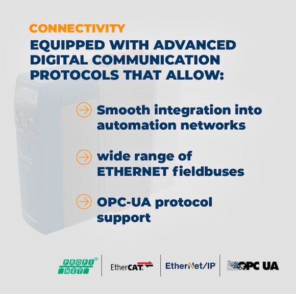 The advanced digital and open communication protocols complying with automation and Industry 4.0 standards allow a smooth integration into automation networks thanks to the compatibility with a wide range of fieldbus protocols and the possibility to extend the AxiaVert series with the OPC-UA protocol.