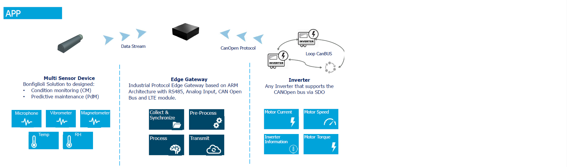 Device sensorization & monitoring + Edge & cloud computing + Bonfiglioli dashboards & customized information