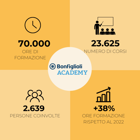 La Bonfiglioli Academy è la nostra piattaforma di e-learning, che comprende al suo interno quattro scuole: Bonfiglioli Culture, Leadership Gym, Professional School e Technical Toolbox. Grazie ad un ampio ventaglio di corsi e opzioni, siamo in grado di coprire le esigenze formative di tutti i collaboratori del Gruppo, garantendo la diffusione del know-how tecnico e dei nostri valori. La Bonfiglioli Academy offre ad ogni dipendente la possibilità di delineare il proprio percorso formativo in piena autonomia.