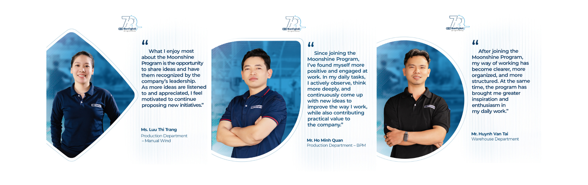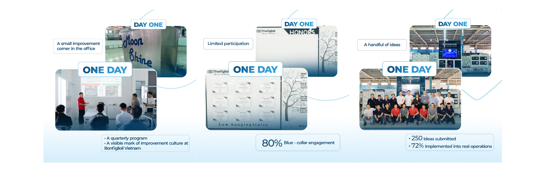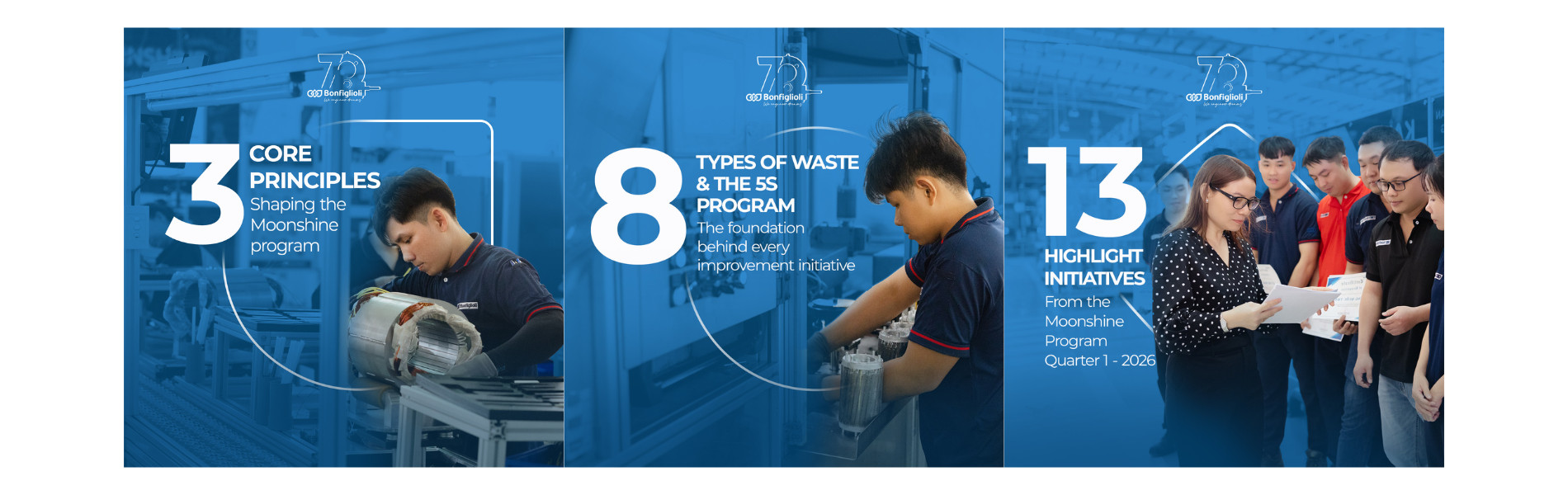 Launched in 2024, the Moonshine Program was born from a simple conviction: the people closest to the work are best positioned to improve it. At Bonfiglioli Vietnam, operators, technicians, and engineers are empowered to identify waste, propose solutions, and implement changes — without waiting for top-down directives or large budgets.