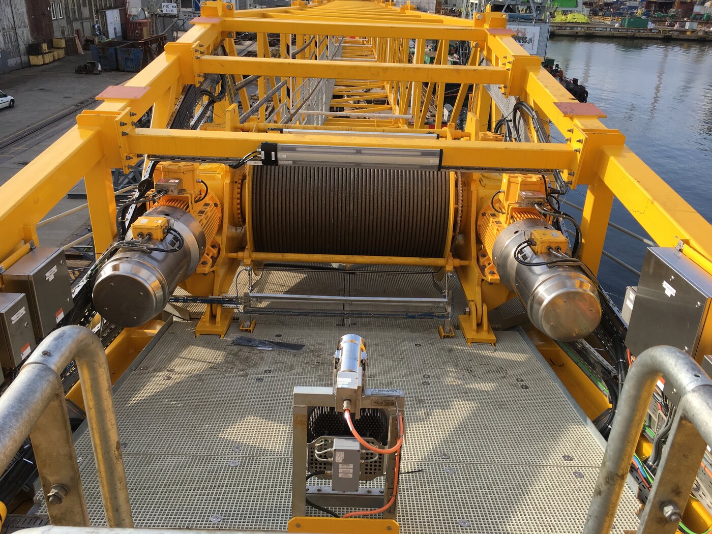 La solución mecánica de Bonfiglioli O&K Antriebstechnik consiste en dos componentes, que se encuentran cada uno en ambos lados del tambor: una brida del motor y un sistema de inclinación que fluye en el actual sistema de cabrestante. Para el cabrestante de la pluma, el reductor angular está diseñado para contar con un freno a prueba de fallos montado frente al lado de potencia del motor para situaciones de emergencia. Esto tiene consecuencias importantes para la seguridad porque la pluma de la grúa permanece en su posición y no puede arquearse ni siquiera cuando se interrumpe la alimentación. Un reductor cónico configurado de modo eficiente transfiere el par de entrada del motor a un reductor planetario del cabrestante ubicado en el tambor del cabrestante. El cabrestante se encuentra en la torre de la grúa y experimenta solo los movimientos giratorios de la torre. No deben existir anomalías al lubricar el reductor angular. Un sistema de control superior garantiza el funcionamiento sincrónico de los accionamientos en ambos lados del cabrestante. El tambor del cabrestante de cable grande de dos metros de ancho está montado cerca de la torre en la pluma de la grúa. Los cuatro accionamientos del cabrestante de cable están predispuestos a ambos lados del tambor del cabrestante con dos accionamientos en cada lado, uno enfrente del otro. Estos motores se montan también con una brida del motor en un reductor angular. Esto transfiere la potencia combinada de los dos motores, que se unen en los ángulos rectos al reductor planetario integrado en el tambor del cabrestante. De particular importancia es el sofisticado sistema de lubricación para la configuración del reductor cónico. Garantiza un suministro excelente del lubricante, independientemente de la posición de la pluma. Los cuatro motores son también alimentados por el convertidor y funcionan en perfecta sincronización con los demás. Los trabajos de pintura en los componentes de accionamiento de Bonfiglioli O&K Antriebstechnik tienes las tres capas necesarias para las aplicaciones marítimas cumpliendo así con los estándares C5M específicos en virtud de la norma ISO 12944 o de cuatro capas según la norma NORSOK M-501. La completa electrificación tiene ventajas evidentes Junto con los accionamientos rotativos eléctricos, la grúa de pluma es accionada eléctricamente. El sistema de control está a la vanguardia de la tecnología actual, opera y reacciona rápidamente y garantiza la seguridad hasta una altura de ola de hasta seis metros, que sólo puede alcanzarse durante la presencia de tormentas. Otra ventaja de los accionamientos eléctricos es que los diagramas de carga optimizada garantizan la flexibilidad en el funcionamiento e incluso habilitan el acceso remoto a la grúa. Puede implementarse para la detección de averías y la asistencia rápida, por ejemplo. Además, el sistema utiliza en gran parte componentes estándar, que facilitan el mantenimiento y aceleran la entrega de los repuestos.