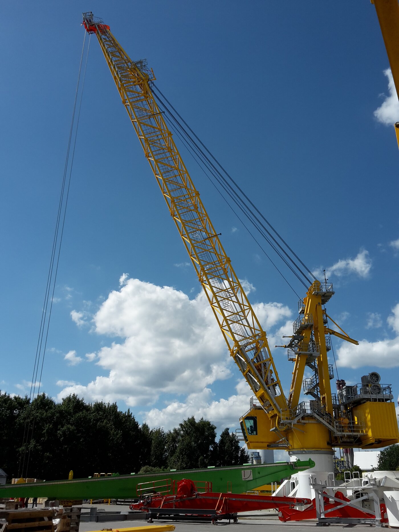 Las exigencias mecánicas desencadenan la ambición de los ingenieros. Para las grúas con pluma de celosía de acero con un alcance de hasta 57 metros y una carga de trabajo segura de 60 toneladas, el objetivo era desarrollar accionamientos eléctricos lo más compactos posibles para el cabrestante principal y el cabrestante del brazo. La estructura de la celosía de acero de la pluma de la grúa impone estrictamente un espacio de instalación porque, por razones de seguridad, nada puede sobresalir de la estructura reticular. Al mismo tiempo, el tamaño de la grúa determina tambián las longitudes y los espesores del cable como las dimensiones del tambor. Incluir las salidas del motor y los pares necesarios y se hizo evidente rápidamente que un simple accionamiento eléctrico no podía cumplir adecuadamente sus prestaciones en el espacio disponible. Por lo tanto, la tarea de diseño era distribuir la potencia a varios motores mientras se transfería el par total al tambor del cabrestante. Espacios de instalación estrechos requieren un layout específico. Según los cálculos en las condiciones dadas, el accionamiento para el cabrestante de cable que opera el gancho se dividió en cuatro tamaños de motores eléctricos según la norma CEI 280, cada uno de los cuales pesa unos 1,2 toneladas. El cabrestante de la pluma tiene dos motores del tamaño CEI 315, cada uno de los cuales pesa 1,7 toneladas. Esto tuvo en cuenta el lado de entrada, pero existía aún otra tarea de diseño a abordar: el layout eficaz y la conexión de los motores al sistema de cabrestante. No solo debía considerarse la transmisión de la potencia de accionamiento sino también el peso y el tamaño de los motores. A unos dos metros de largo y con el citado peso de carga por motor, los motores asíncronos especiales son un factor importante. Cuando se trata de la distribución de la carga de accionamiento, que es manejada por control electrónico, los elementos puramente mecánicos deben predisponerse también de modo seguro.